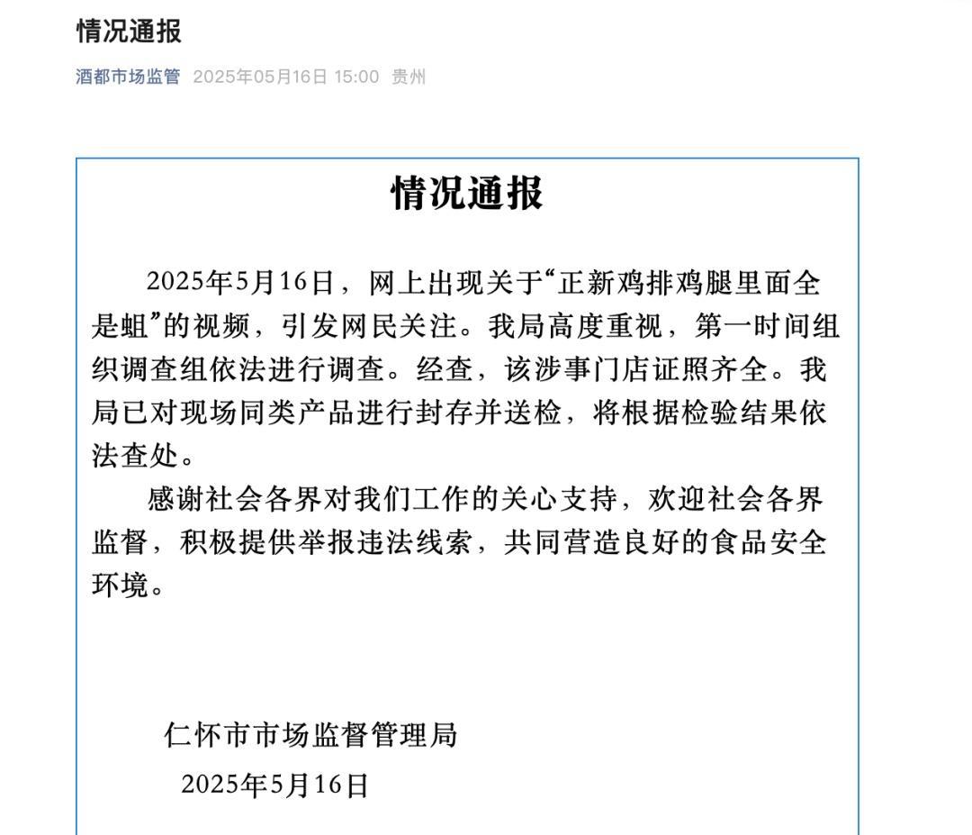 5月16日,仁怀市市场监督管理局发布通报称,网上出现关于“正新鸡排鸡腿里面全是蛆”的视频,引发网民关注。“我局高度重视,第一时间组织调查组依法进行调查。经查,该涉事门店证照齐全。我局已对现场同类产品进行封存并送检,将根据检验结果依法查处。”